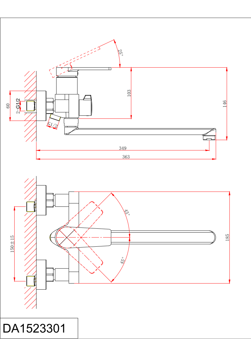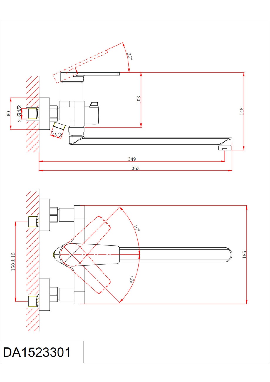 DA1523301 Смеситель для ванны с душем, длинный излив, хром
