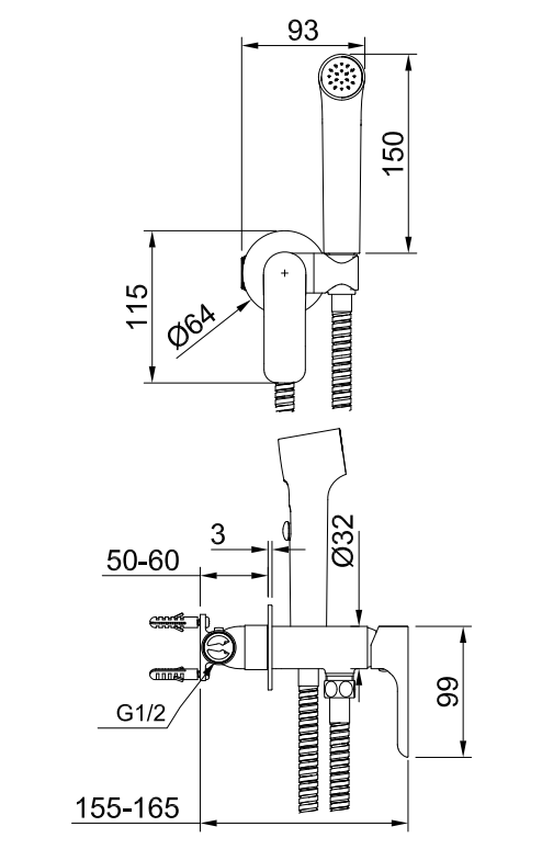Смеситель настенный с гигиеническим душем, черный Raglo, R51.51.06